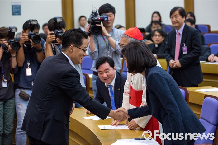 (서울=포커스뉴스) 박지원(왼쪽) 국민의당 비상대책위원장과 나경원(오른쪽) 새누리당 의원이 4일 오전 서울 여의도 국회의원회관에서 열린 '생명존중포럼 창립총회'에 참석해 악수 하고 있다.