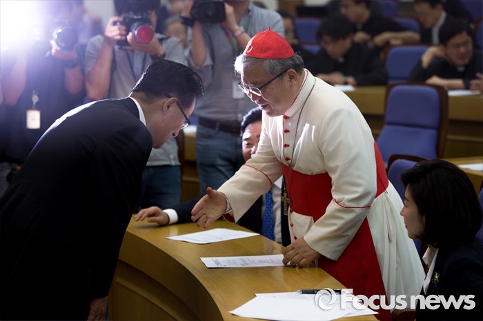 (서울=포커스뉴스) 염수정(가운데) 추기경과 박지원 국민의당 비상대책위원장이 4일 오전 서울 여의도 국회의원회관에서 열린 '생명존중포럼 창립총회'에 참석해 인사 하고 있다.
