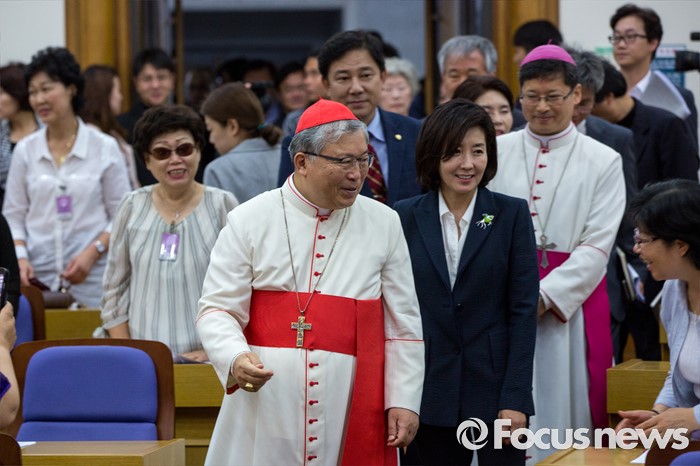(서울=포커스뉴스) 염수정 추기경과 나경원 새누리당 의원이 4일 오전 서울 여의도 국회의원회관에서 열린 '생명존중포럼 창립총회'에 참석하기 위해 총회장으로 들어서고 있다.