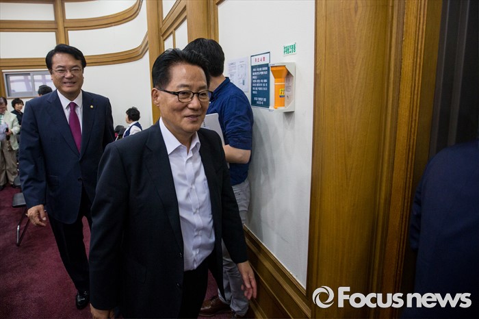 | △ 총회장 나서는 박지원 위원장-정진석 원내대표 |