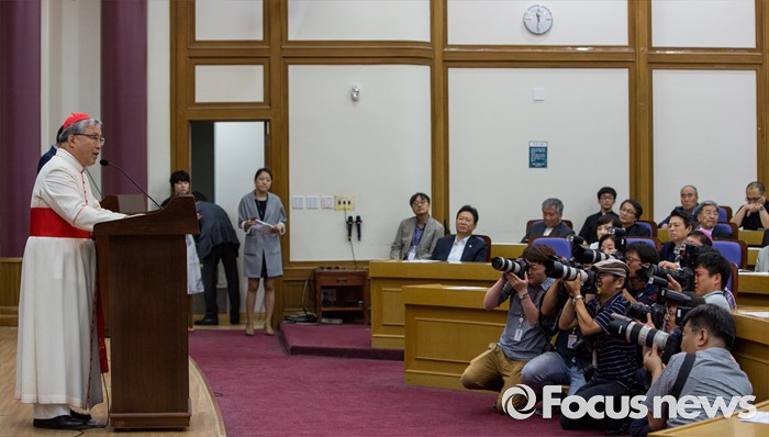 (서울=포커스뉴스) 염수정 추기경이 4일 오전 서울 여의도 국회의원회관에서 열린 '생명존중포럼 창립총회'에 참석해 강론 하고 있다.