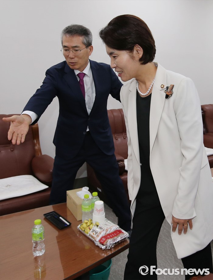 (세종=포커스뉴스) 국회 환경노동위원회 한정애 더불어민주당 간사가 4일 오후 세종시 정부세종청사 최저임금위원회를 찾아 박준성 위원장과 면담을 하기 위해 위원장실로 이동하고 있다. 송옥주 의원.