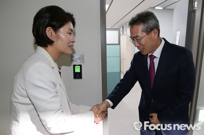 (세종=포커스뉴스) 국회 환경노동위원회 한정애 더불어민주당 간사가 4일 오후 세종시 정부세종청사 최저임금위원회를 찾아 박준성 위원장과 면담에 앞서 인사를 하고 있다.