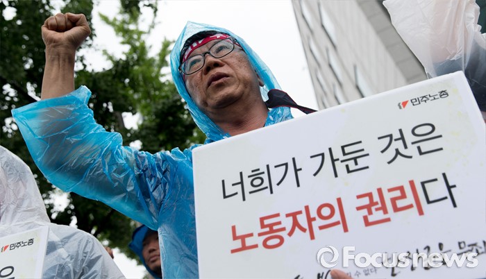 (서울=포커스뉴스) 4일 오후 서울중앙지방법원 앞에서 전국민주노동조합총연맹이 한상균 위원장 석방 판결 촉구 결의대회를 하고 있다.