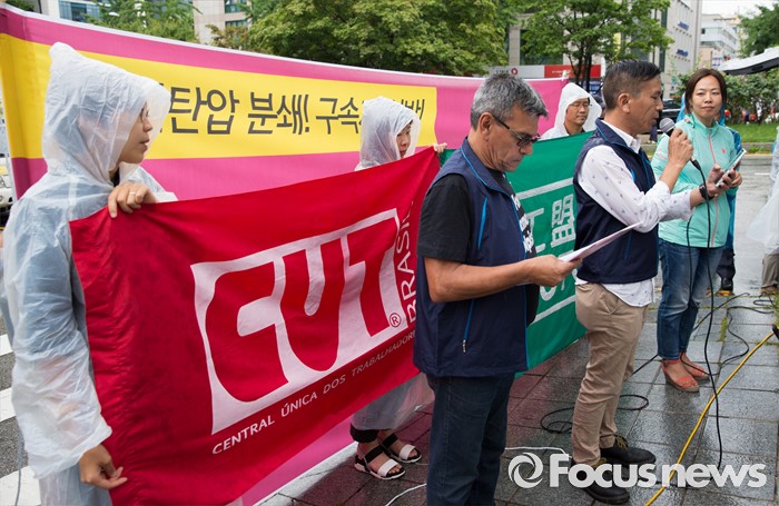 (서울=포커스뉴스) 4일 오후 서울중앙지방법원 앞에서 열린 한상균 위원장 석방 판결 촉구 결의대회에서 곽수이킷(오른쪽 두번째) 홍콩노총(HKCYU) 부위원장이 발언하고 있다. 왼쪽 두번째는 조제 셀레스치누 로렌쏘.