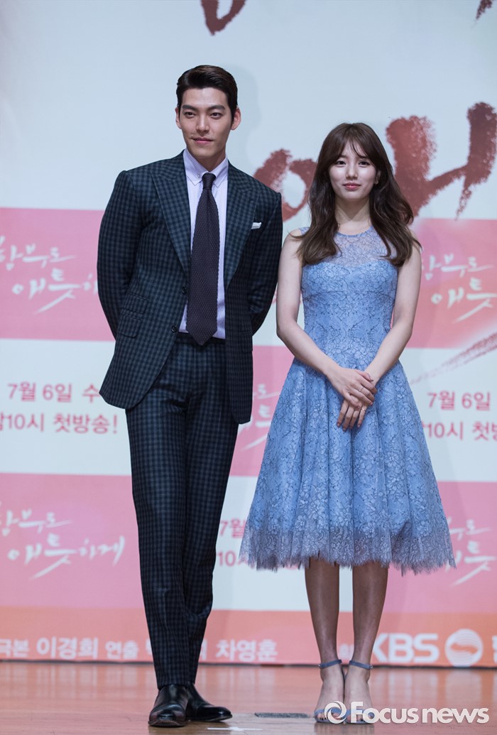 (서울=포커스뉴스) 4일 오후 서울 용산구 하얏트호텔 그랜드볼룸에서 열린 KBS 특별기획드라마 '함부로 애틋하게' 제작발표회에 참석한 배우 김우빈(왼쪽)과 배수지가 포토타임을 갖고 있다.