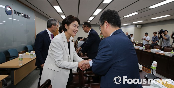 (세종=포커스뉴스)한정애(왼쪽 두 번째) 국회 환노위 더불어민주당 간사가 4일 오후 세종시 정부세종청사 고용노동부 최저임금위원회 전원회의실에서 열린 제8차 전원회의를 방문, 위원들과 악수를 하고 있다.