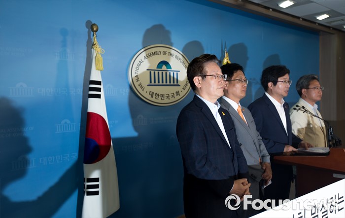 (서울=포커스뉴스) 경기지역 시장들이 4일 오후 서울 여의도 국회에서 행정자치부의 지방재정법 시행령 개정안 입법예고 철회를 촉구하는 기자회견을 하고 있다. 왼쪽부터 이재명 경기도 성남시장, 최성 경기도 고양시장, 염태영 경기도 수원시장, 채인석 경기도 화성시장.