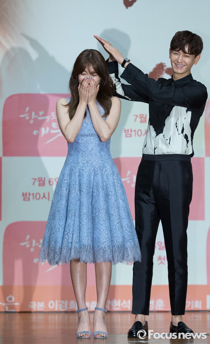 (서울=포커스뉴스) 4일 오후 서울 용산구 하얏트호텔 그랜드볼룸에서 열린 KBS 특별기획드라마 '함부로 애틋하게' 제작발표회에 참석한 배우 배수지(왼쪽)와 임주환이 포토타임을 갖고 있다.