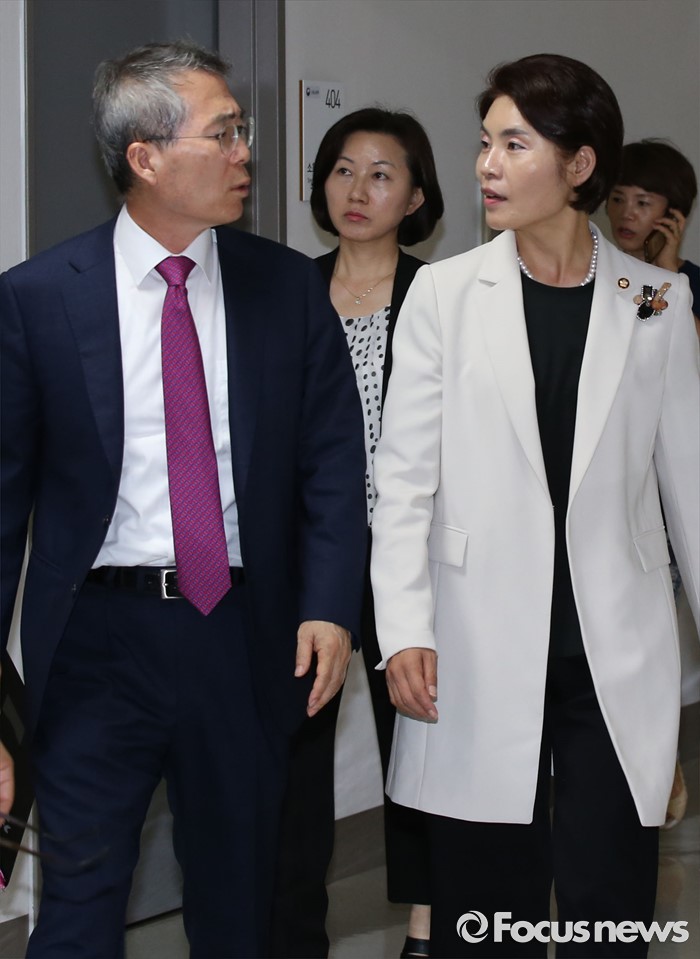 (세종=포커스뉴스) 박준성(왼쪽) 위원장과 한정애(오른쪽) 국회 환노위 더불어민주당 간사와 송옥주 의원이4일 오후 세종시 정부세종청사 고용노동부 최저임금위원회 전원회의실에서 열린 제8차 전원회의에 방문하고 있다.