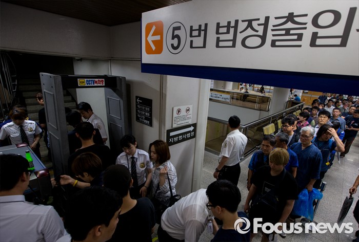 (서울=포커스뉴스) 4일 오후 서울중앙지법 5번 출입구 앞에서 민주노총 조합원 및 관계자들이 한상균 위원장의 1심 선고 공판을 방청하기 위해 줄지어 기다리고 있다. 지난해 11월 열린 민중총궐기 대회 불법 시위 주도 혐의로 기소된 한 위원장은 이날 열린 1심 재판에서 징역 5년을 선고받았다.