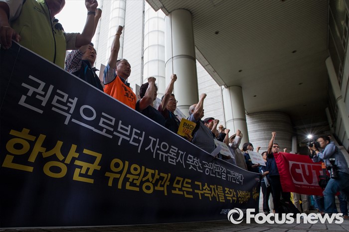 (서울=포커스뉴스) 4일 오후 서울중앙지법 앞에서 한상균 민주노총 위원장의 1심 선고 공판 후 열린 기자회견에 참석한 최종진 부위원장 및 조합원들이 판결의 부당함을 주장하는 구호를 외치고 있다. 지난해 11월 열린 민중총궐기 대회 불법 시위 주도 혐의로 기소된 한 위원장은 이날 열린 1심 재판에서 징역 5년을 선고받았다.