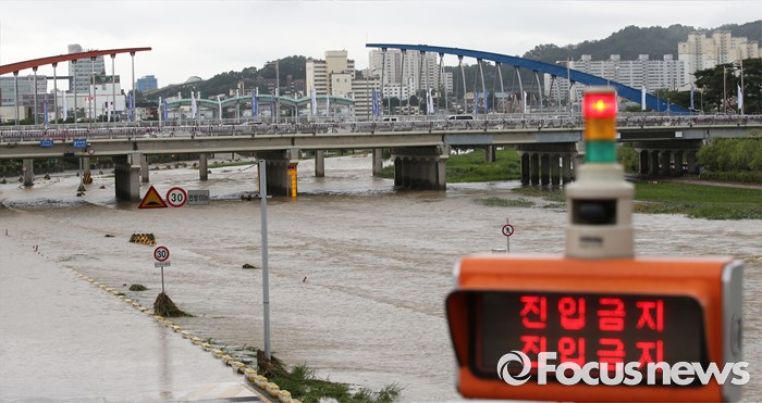 (청주=포커스뉴스) 충청 및 중부지역에 호우경보가 발생한 4일 오후 충북 청주시 무심천 하상도로가 내린비로 잠겨 있다.