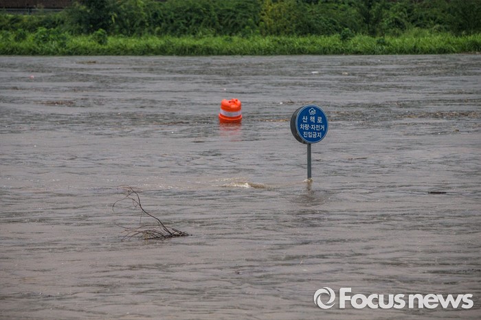 (서울=포커스뉴스) 최고 300mm 물폭탄이 내릴 것으로 예고되어 전국적으로 호우주의보와 경보가 내린 5일 오전 서울 중랑구 중랑천 월릉교 인근 둔치의 시민공원이 물에 잠겨 있다.