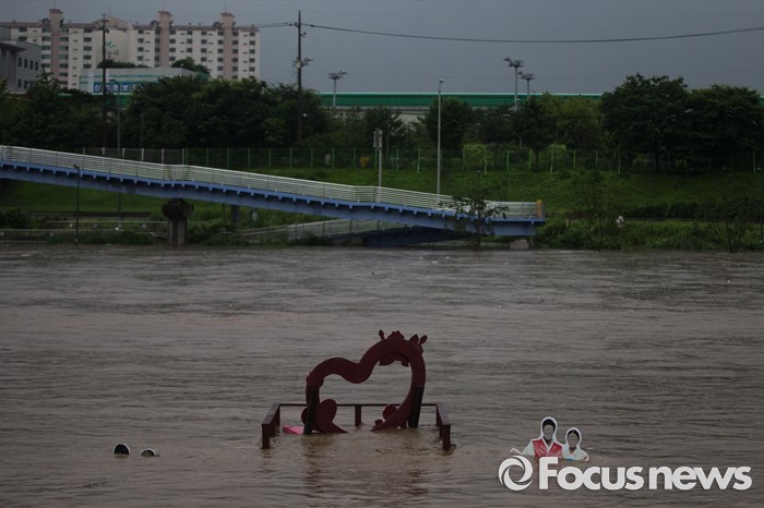 (서울=포커스뉴스) 최고 300mm 물폭탄이 내릴 것으로 예고되어 전국적으로 호우주의보와 경보가 내린 5일 오전 서울 중랑구 중랑천 월릉교 인근 둔치의 시민공원이 물에 잠겨 있다.