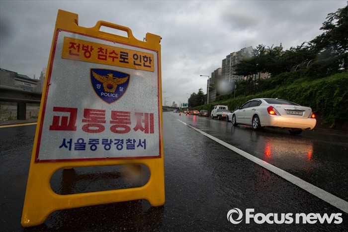 (서울=포커스뉴스) 최고 300mm 물폭탄이 내릴 것으로 예고되어 전국적으로 호우주의보와 경보가 내린 5일 오전 서울 중랑구 중랑천 월릉교 인근 둔치의 시민공원이 물에 잠겨 경찰이 교통통제하고 있다.