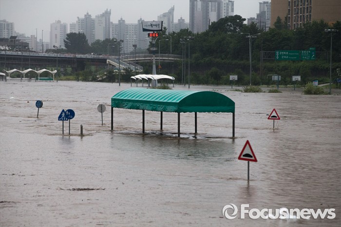 (서울=포커스뉴스) 최고 300mm 물폭탄이 내릴 것으로 예고되어 전국적으로 호우주의보와 경보가 내린 5일 오전 서울 중랑구 중랑천 월릉교 인근 둔치의 시민공원이 물에 잠겨 있다.