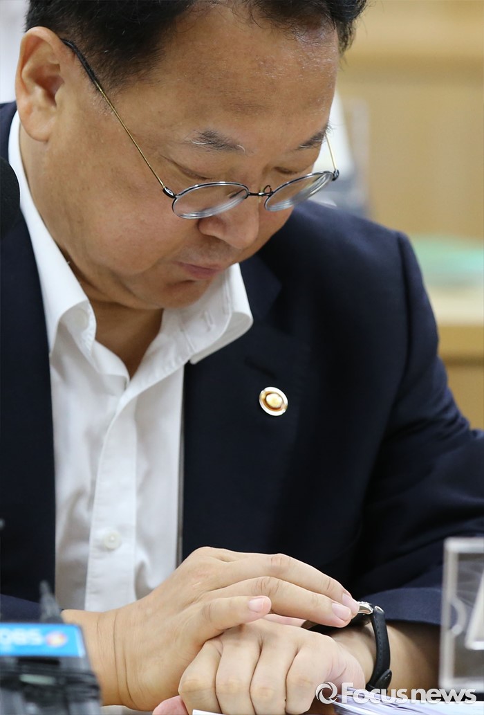 (세종=포커스뉴스) 유일호 경제부총리 겸 기획재정부장관이 5일 오전 서울-세종 영상회의로 열린 경제관계장관회의에 참석해 시계를 보고 있다.