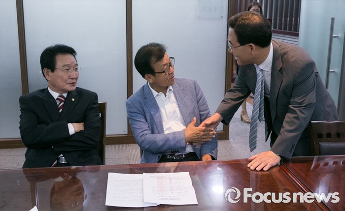 (서울=포커스뉴스) 5일 오전 서울 여의도 국회 의원회관 의원식당에서 열린 남북관계 정상화를 위한 여야 중진 의원 1차 모임에 참석한 주호영(오른쪽부터) 새누리당 의원, 원혜영, 변재일 더불어민주당 의원이 인사하고 있다.