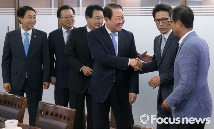 (서울=포커스뉴스) 5일 오전 서울 여의도 국회 의원회관 의원식당에서 열린 남북관계 정상화를 위한 여야 중진 의원 1차 모임에 참석한 의원들이 인사하고 있다. 왼쪽부터 조정식, 김부겸, 변재일 더불어민주당 의원, 박주선 국민의당 의원, 정병국 새누리당 의원, 원혜영 더불어민주당 의원.