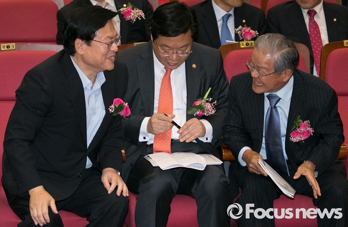 (서울=포커스뉴스) 5일 오전 서울 여의도 국회 의원회관에서 열린 미래성장 경제정책포럼 창립총회에 참석한 정우택(왼쪽부터) 새누리당 의원, 주형환 산업통상자원부 장관, 권태신 한국경제연구원장이 대화하고 있다.