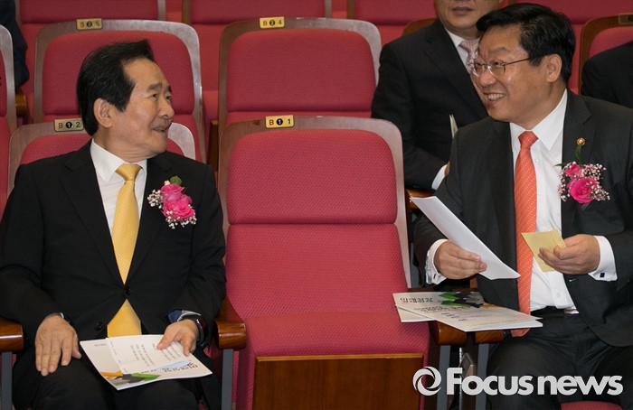 (서울=포커스뉴스) 5일 오전 서울 여의도 국회 의원회관에서 열린 미래성장 경제정책포럼 창립총회에 참석한 정세균(왼쪽) 국회의장과 주형환 산업통상자원부 장관이 대화하고 있다.