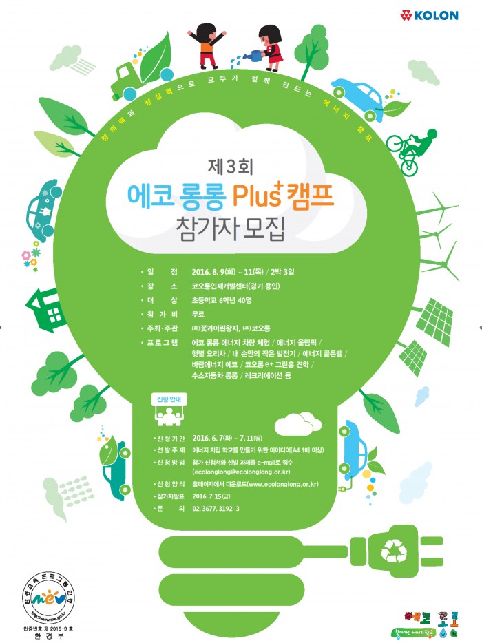 현재까지 809개 학교 7만134명의 학생들이 참여했다. '에코 롱롱' 프로그램은 2011년 환경부로부터 환경교육프로그램 인증을 받은데 이어 2013년부터 3개년 연속 우수환경교육 프로그램으로 선정된 바 있다.'제3회 에코 롱롱 플러스 캠프' 참가자 모집을 알리는 포스터.<사진제공=코오롱>