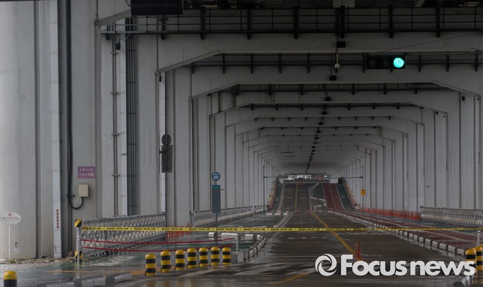 (서울=포커스뉴스) 장마전선이 북상하면서 전국 곳곳에 호우특보가 발표 중인 5일 오전 서울 서초구 잠수교가 통제되고 있다.