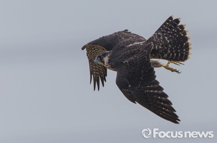 (인천=포커스뉴스)송골매 유조 암컷이 첫 비행을 하고 있다.