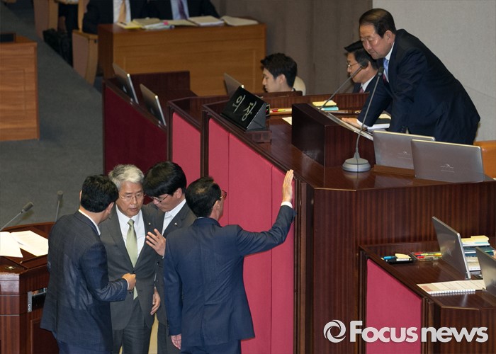 (서울=포커스뉴스) 5일 오전 서울 여의도 국회에서 열린 343회 국회(임시회) 7차 본회의, 정치·외교·통일·안보·교육·사회·문화에 관한 질문에 참석한 이장우 새누리당 의원 등과 김동철 국민의당 의원이 언쟁을 벌이자 김도읍 새누리당 원내수석부대표, 박완주 더불어민주당 원내수석부대표, 김관영 국민의당 원내수석부대표와 박주선 국회 부의장이 논의하고 있다.