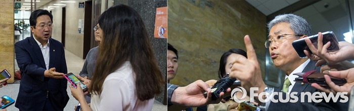 (서울=포커스뉴스) 이장우(왼쪽) 새누리당 의원과 김동철 국민의당 의원이 5일 오전 서울 여의도 국회에서 열린 '343회 국회(임시회) 7차 본회의 정치, 외교, 통일, 안보, 교육, 사회, 문화에 관한 질문에 참석해 언쟁을 벌인 뒤 취재진과 인터뷰 하고 있다.