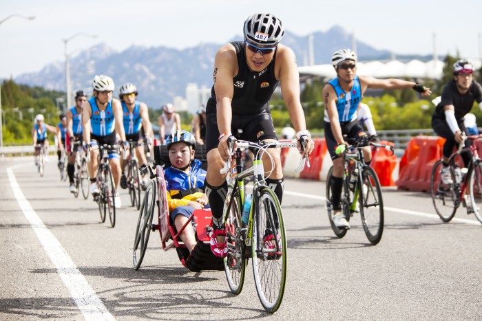 롯데는 이날 박군의 수술비 1000만원을 전달하고 선수들의 응원메시지를 공개할 계획이다.아버지와 함께 철인 3종 경기에 출전한 박은총 군. <사진제공=롯데 자이언츠>