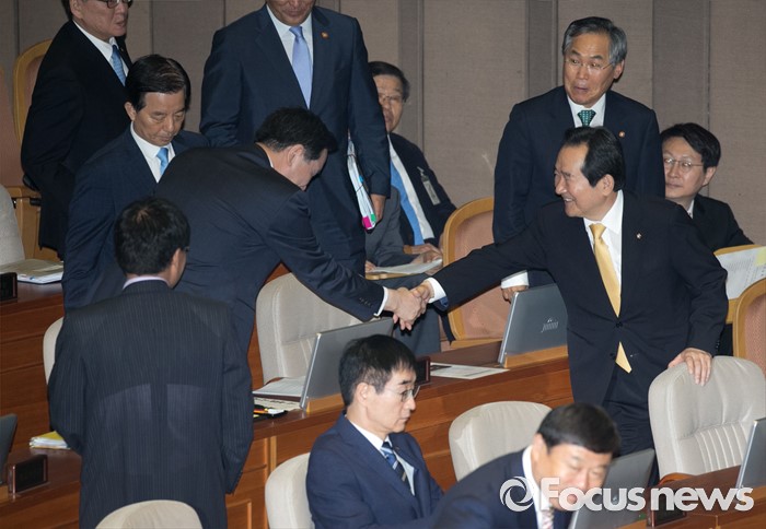 (서울=포커스뉴스) 5일 오전 서울 여의도 국회에서 열린 343회 국회(임시회) 7차 본회의, 정치·외교·통일·안보·교육·사회·문화에 관한 질문에 참석한 정세균 국회의장이 국무위원들과 인사하고 있다.