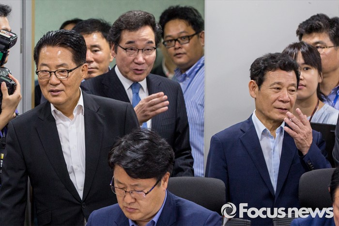 (서울=포커스뉴스) 박지원(왼쪽) 국민의당 비상대책위원장과 이낙연(가운데) 전라남도 도지사, 윤장현 광주광역시 시장이 5일 오후 서울 여의도 국회의원회관에서 열린 '2017년 국비확보관련 광주 및 전남 국회의원 간담회'에 참석하기 위해 회의실로 들어서고 있다.