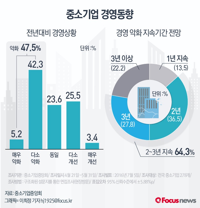 (서울=포커스뉴스) 5일 중소기업중앙회가 발표한 '최근 중소기업 현장동향 조사보고서'에 따르면 전년대비 경영상황이 '악화됐다'는 중소기업이 47.5%에 달했다. 경영악화 상황도 2~3년 지속할 것으로 예상하는 기업이 전체의 2/3를 차지해 경영상의 어려움이 단기간에 쉽게 해소되지 않을 것을 시사했다.