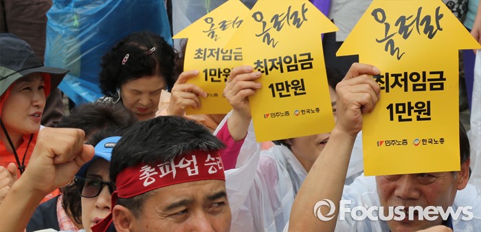 (세종=포커스뉴스) 최저임금위원회 제9차 전원회의가 열린 5일 오후 세종시 정부세종청사 고용노동부 앞에서 한국노총, 민주노총 조합원들이 최저임금 1만원 쟁취 결의대회를 갖고 있다