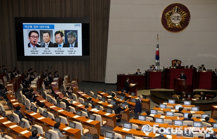 (서울=포커스뉴스) 5일 오후 서울 여의도 국회에서 열린 343회 국회(임시회) 7차 본회의, 정치·외교·통일·안보·교육·사회·문화에 관한 질문에 참석한 표창원 더불어민주당 의원이 황교안 국무총리에게 박근혜 정부 공직자들의 성범죄 논란과 관련 질문하고 있다.