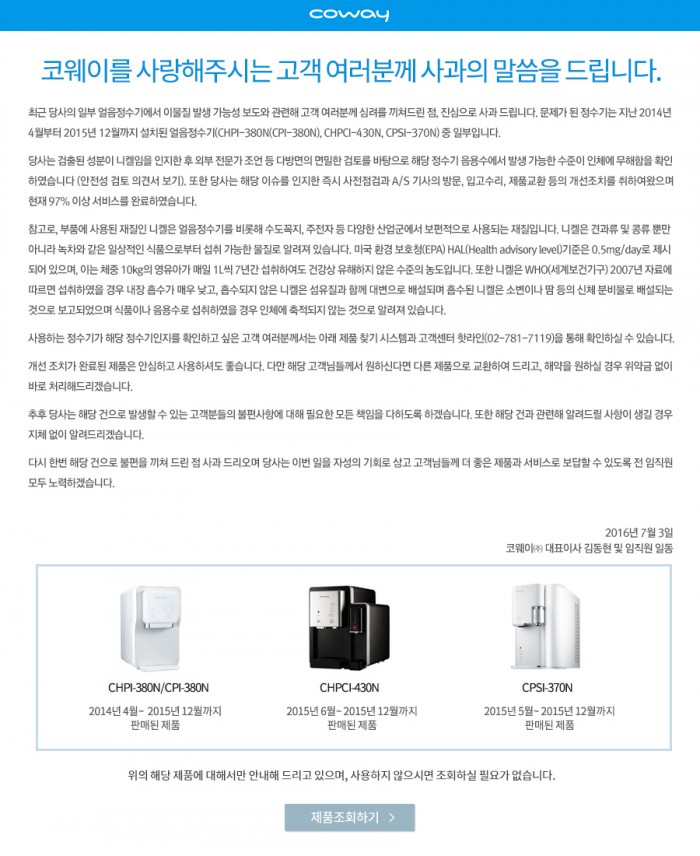 게다가 중금속 검출 사실을 알고도 1년간이나 숨긴 것이 탄로나면서 기업 신로도에도 치명타를 입었다. 코웨이가 회사 홈페이지에 글을 올려 사과했지만 단시간에는 무너진 소비자들의 신뢰 회복이 어려워 보인다는 게 업계의 시각이다.