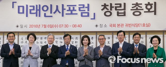 (서울=포커스뉴스) 6일 오전 서울 여의도 국회 귀빈식당에서 열린 미래인사포럼 창립총회에 참석한 나경원 새누리당 의원, 이근면 전 인사혁신처장 등 참석자들이 기념촬영을 하고 있다.
