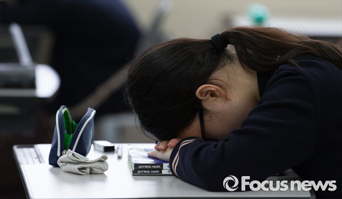 (서울=포커스뉴스) 6일 오전 서울 은평구 신도고등학교에서 3학년 학생이 2016학년도 7월 전국연합학력평가 시험 전 휴식을 취하고 있다.