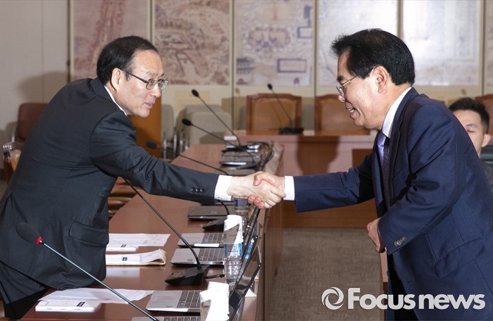 (서울=포커스뉴스) 6일 오전 서울 여의도 국회에서 열린 윤리특별위원회 전체회의에 참석한 백재현(오른쪽) 위원장과 오세정 국민의당 간사가 인사하고 있다.