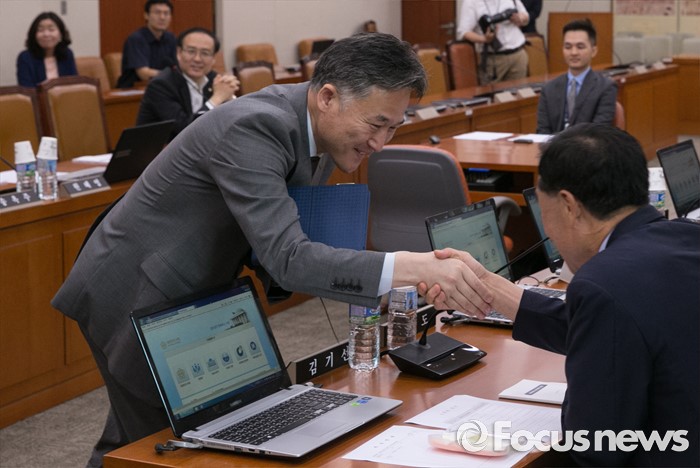 (서울=포커스뉴스) 6일 오전 서울 여의도 국회에서 열린 윤리특별위원회 전체회의에 참석한 표창원 더불어민주당 의원이 의원들과 인사하고 있다.