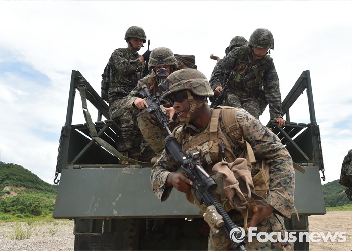 (서울=포커스뉴스) 5일 오후 경북 포항에서 실시한 연합 공지전투훈련에서 참가한 한미 해병대 장병들이 차량에서 신속히 하차하여 적진으로 돌격하고 있다.