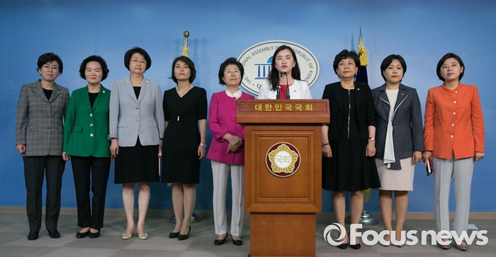 (서울=포커스뉴스) 6일 오전 서울 여의도 국회 정론관에서 새누리당 여성 의원들이 표창원 더불어민주당 의원의 대정부 질문 중 학교전담경찰관 발언 논란과 관련 사과 촉구 기자회견을 하고 있다. 왼쪽부터 최연혜, 윤종필, 김승희, 전희경, 이은재, 신보라, 김순례, 송희경, 김정재 의원.