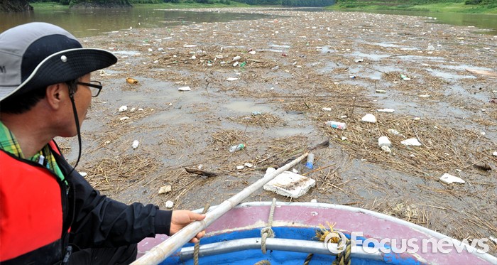 (옥천=포커스뉴스) 며칠간 이어진 중부지역 집중호우로 6일 오후 충북 옥천군 군복면 대청호 상류 일대에 쓰레기로 뒤덮혀 있다.