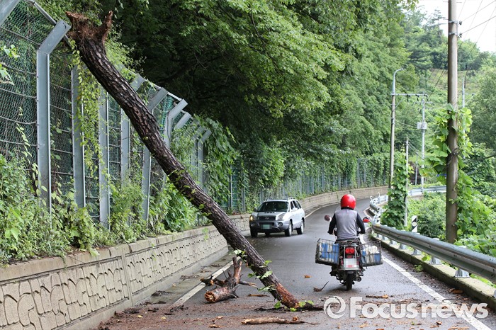(옥천=포커스뉴스) 며칠간 이어진 중부지역 집중호우로 6일 오후 충북 옥천군 군복면 도로에 나무가 쓰려져 있다.