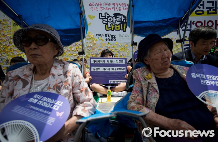 (서울=포커스뉴스) 6일 오후 서울 종로구 주한일본대사관 앞에서 열린 일본군 '위안부' 문제 해결을 위한 제1238차 정기 수요집회에 김복동(왼쪽) 할머니와 길원옥 할머니가 참석하고 있다.