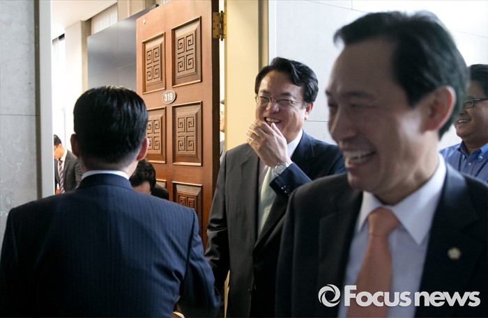(서울=포커스뉴스) 6일 오후 서울 여의도 국회에서 운영위원회 전체회의를 마친 정진석(가운데) 새누리당 원내대표와 우상호(오른쪽) 더불어민주당 원내대표, 박지원 국민의당 원내대표가 이동하고 있다.