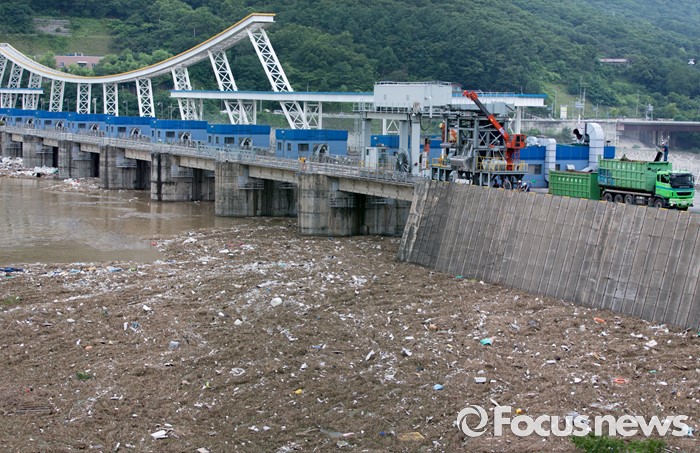 (남양주=포커스뉴스) 서울과 수도권 지역의 장마전선이 소강상태를 보이고 있는 6일 오전 경기도 남양주 팔당댐에 많은 부유물들이 떠내려와 있다.