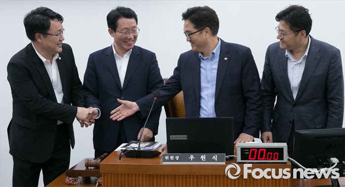 (서울=포커스뉴스) 6일 오후 서울 여의도 국회에서 가습기살균제 사고 진상규명과 피해구제 및 재발방지 대책마련을 위한 국정조사특별위원회 전체회의를 마친 우원식 위원장과 3당 간사가 취재진을 향해 포즈를 취하고 있다. 왼쪽부터 송기석 국민의당 간사, 김상훈 새누리당 간사, 우 위원장, 홍익표 더불어민주당 간사.